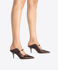 A signature silhouette in a rich new mood. Reimagined in dark brown satin with tonal metallic Nappa straps, the Maureen mule brings soft sophistication to the season. With its pointed toe, wave-cut curves and a 70mm stiletto heel, it elevates every step with considered ease. - Colour: Tobacco - Material: Satin/Metallic Nappa - Sole and Lining: 100% Leather - Style: Heeled Mules - Handmade in Italy - Fitting: Fits small to size, take half a size larger SIZE & FIT - Fits small to size, take half a size larger - Italian sizing - Model wears size IT37, US7, UK4 - Heel height 70mm/2.7in