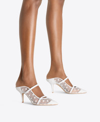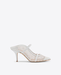 An icon reimagined for the moments that matter most. Crafted in delicate floral mesh, the Maureen mule pairs a pointed toe with a 70mm stiletto heel. Its signature double straps contrast beautifully with the sheer finish, framing the foot with timeless elegance. - Colour: White - Material: Floral Mesh/ Nappa - Sole and Lining: 100% Leather - Style: Mules - Handmade in Italy - Fitting: Fits small to size, take half a size larger SIZE & FIT - Fits small to size, take half a size larger - Italian sizing - Model wears size IT37, US7, UK4 - Heel height 70mm/2.7in