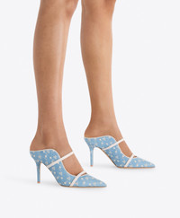 The Maureen mule steps into the season in blue floral denim. Framed by smooth white Nappa leather trims and the silhouette's iconic double straps, the pointed-toe mule is set on a slim 85mm stiletto heel. Its artisanal texture brings a playful, feminine twist to a signature style. - Colour: Blue/Cream - Material: Floral Denim/Nappa - Sole and Lining: 100% Leather - Style: Mules - Handmade in Italy - Fitting: Fits small to size, take half a size larger SIZE & FIT - Fits small to size, take half a size larger - Italian sizing - Model wears size IT37, US7, UK4 - Heel height 85mm/3.3in