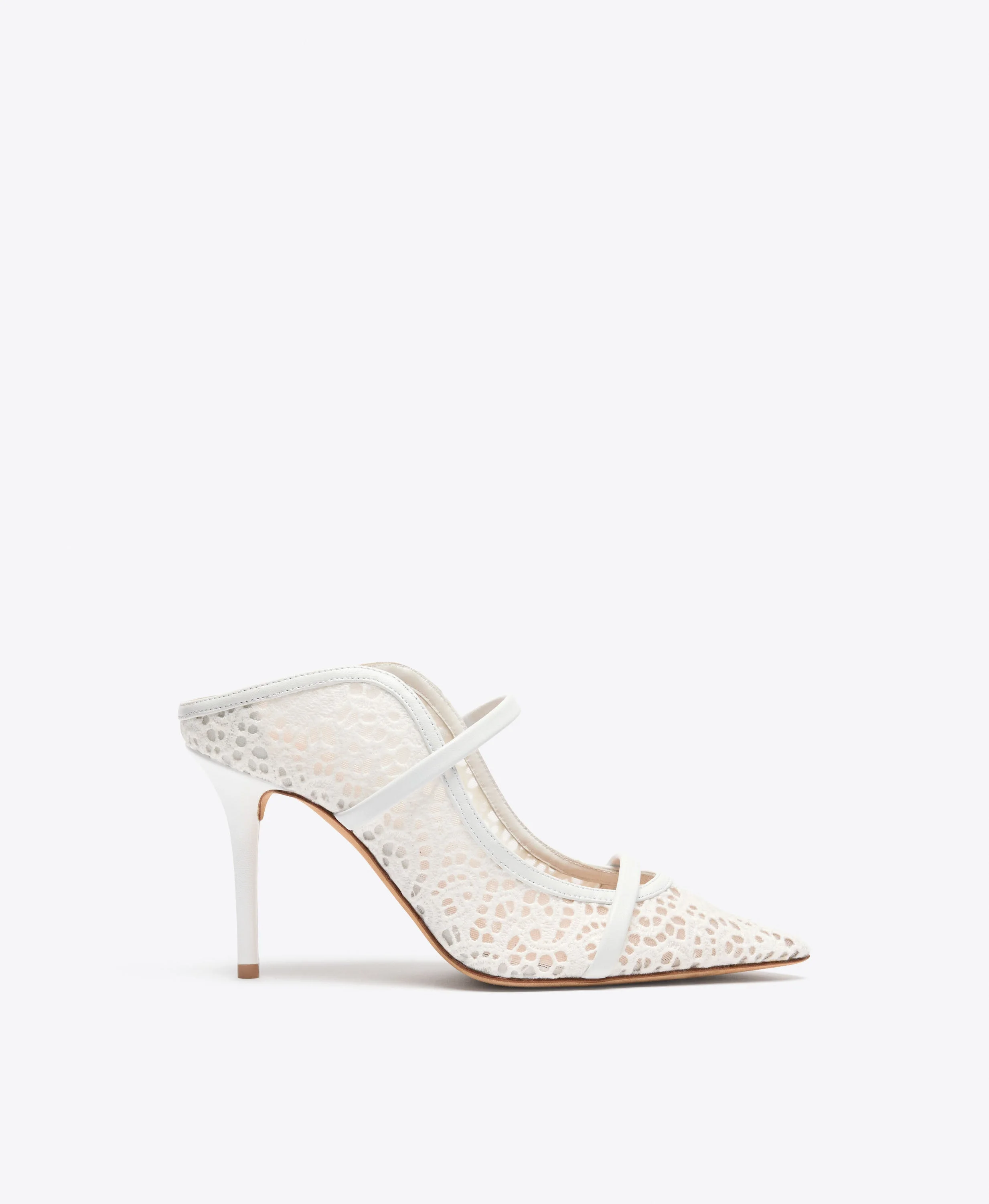 A timeless expression of craftsmanship and femininity. This season, Maureen is reimagined in a fully embroidered fabric inspired by traditional broderie anglaise. Set on an 85mm stiletto heel, smooth Nappa leather straps trace the foot in signature Maureen style. - Colour: White - Material: Broderie Mesh/Nappa - Sole and Lining: 100% Leather - Style: Mules - Handmade in Italy - Fitting: Small to size SIZE & FIT - Small to size - Italian sizing - Model wears size IT37, US7, UK4 - Heel height 85mm/3.3in