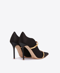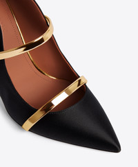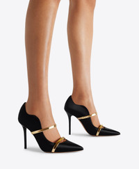 An icon of feminine sophistication, we made our name with the Maureen. A stiletto heel in black satin with an unmistakeable wave-like silhouette, the Maureen combines graceful lines with superior comfort. Dispensing with the usual backless design in favour of a closed heel, it is finished with a padded insole and stretchable arch strap in contrasting gold mirror leather. - Colour: Black/Gold - Material: Satin/Mirror Leather - Sole and Lining: 100% Leather - Style: Stiletto Heel - Handmade in Italy SIZE & FIT - Fits small to size, take half a size larger - Italian sizing - Model wears size IT37, US7, UK4 - Heel height 100mm/4in