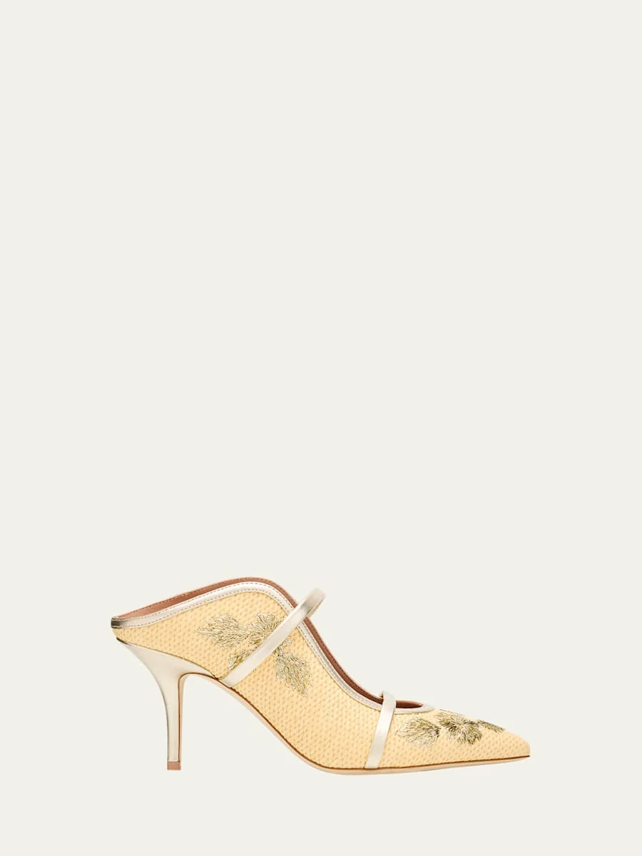 Malone Souliers "Maureen" woven raffia mule pumps with metallic leather trim 2.75 in / 70 mm stiletto heel Pointed toe Dual band upper Slide style Leather outsole Lining: Unlined Made in Italy