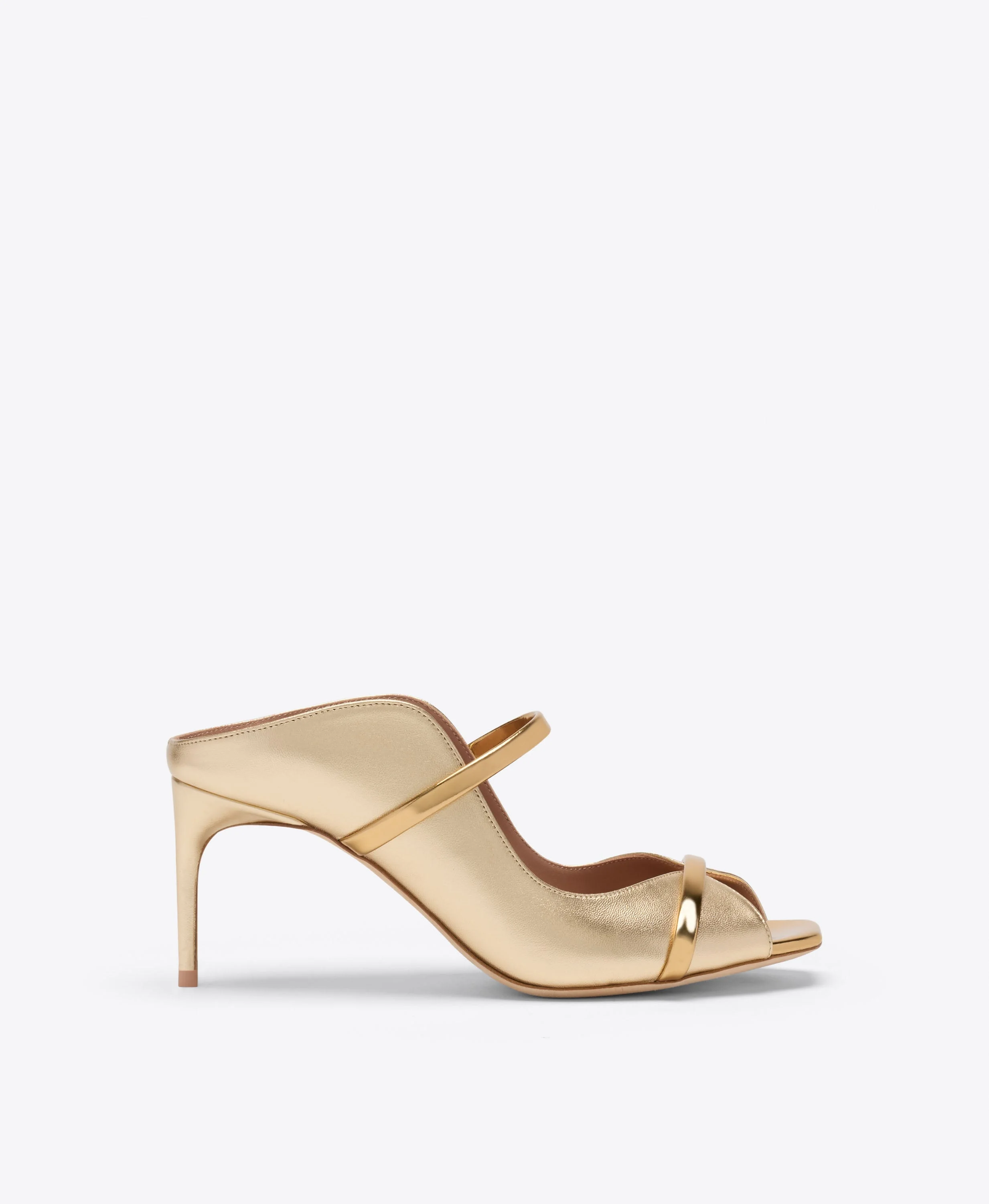 The Noah mule brings a golden touch to the season. In antique gold metallic Nappa with mirrored double straps, this heeled sandal balances a softly shimmering finish with a pointed toe and a graceful 70mm heel. - Colour: Antique Gold - Material: Metallic Nappa/Mirror Leather - Sole and Lining: 100% Leather - Style: Sandals - Handmade in Italy - Fitting: True to size