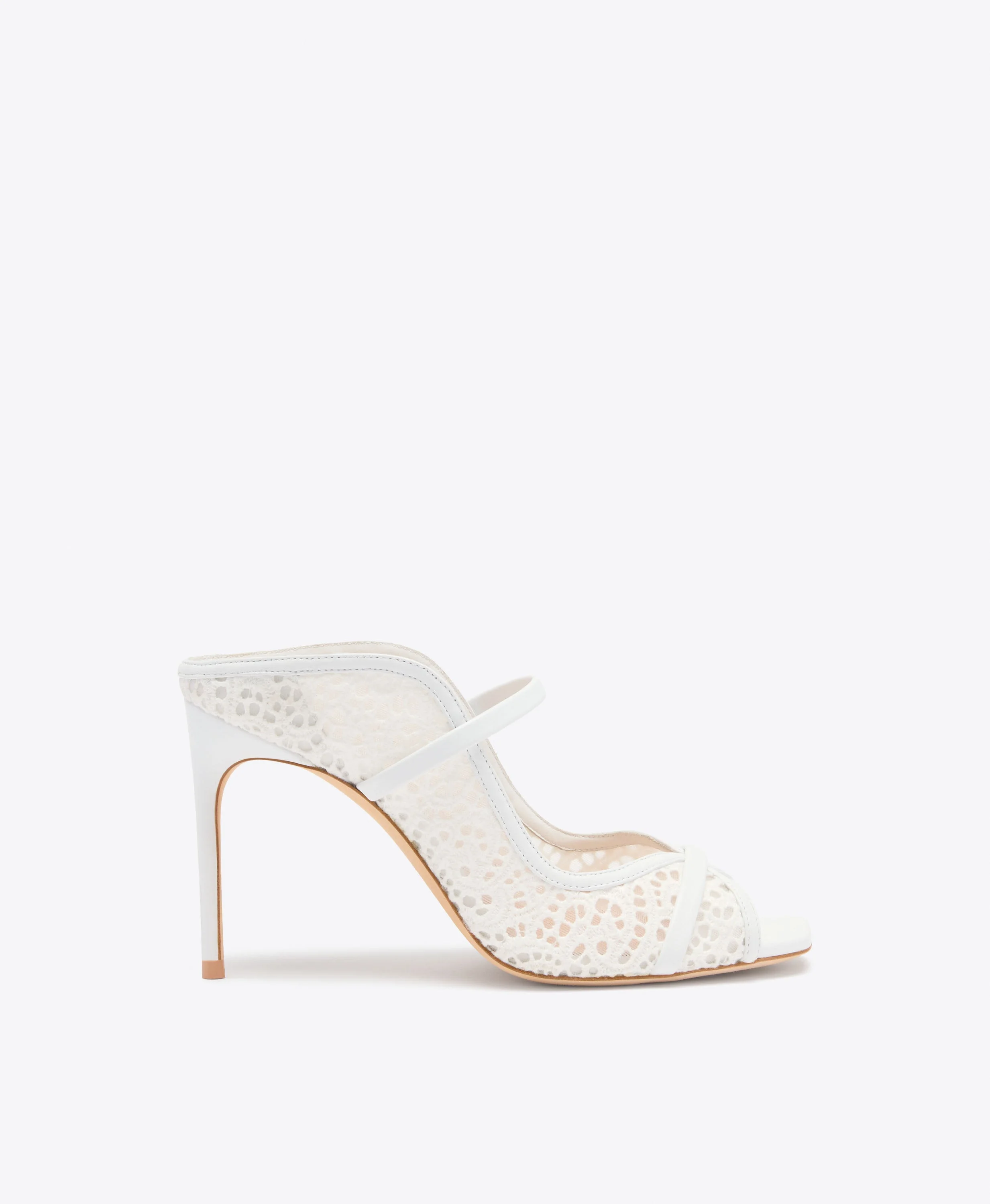 Delicate details meet sculptural allure. Handcrafted in Italy, the Noah sandal features fully embroidered broderie mesh with intricate cutwork and fine texture. Framed by smooth Nappa leather straps and set on a 90mm stiletto heel, it redefines elegance with a modern touch. - Colour: White - Material: Broderie Mesh/Nappa - Sole and Lining: 100% Leather - Style: Sandals - Handmade in Italy - Fitting: True to size SIZE & FIT - True to size - Italian sizing - Model wears size IT37, US7, UK4 - Heel height 90mm/3.5in