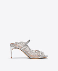 Sculptural elegance with a silvered edge. The Noah 70mm stiletto mule is elevated by slender metallic leather straps that trace the foot's natural curve in a wave-like silhouette. Soft, shimmering and endlessly versatile, it's crafted from grey mesh embroidered with silver florals. - Colour: Grey/Silver - Material: Mesh/Metallic Nappa - Sole and Lining: 100% Leather - Style: Sandals - Handmade in Italy - Fitting: True to size - Ramadan Exclusive SIZE & FIT - True to size - Italian sizing - Model wears size IT37, US7, UK4 - Heel height 70mm/2.7in