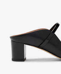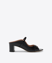 Modern minimalism, refined. The Norah sandal returns in smooth black leather, pairing soft Nappa with a subtle patent contrast for an elevated edge. Defined by slim double straps and a squared toe, this sculptural silhouette is finished with a 45mm block heel. - Colour: Black - Material: Nappa/Patent - Sole and Lining: 100% Leather - Style: Heeled Sandals - Handmade in Italy - Fitting: True to size SIZE & FIT - True to size - Italian sizing - Model wears size IT37, US7, UK4 - Heel height 45mm/1.7in