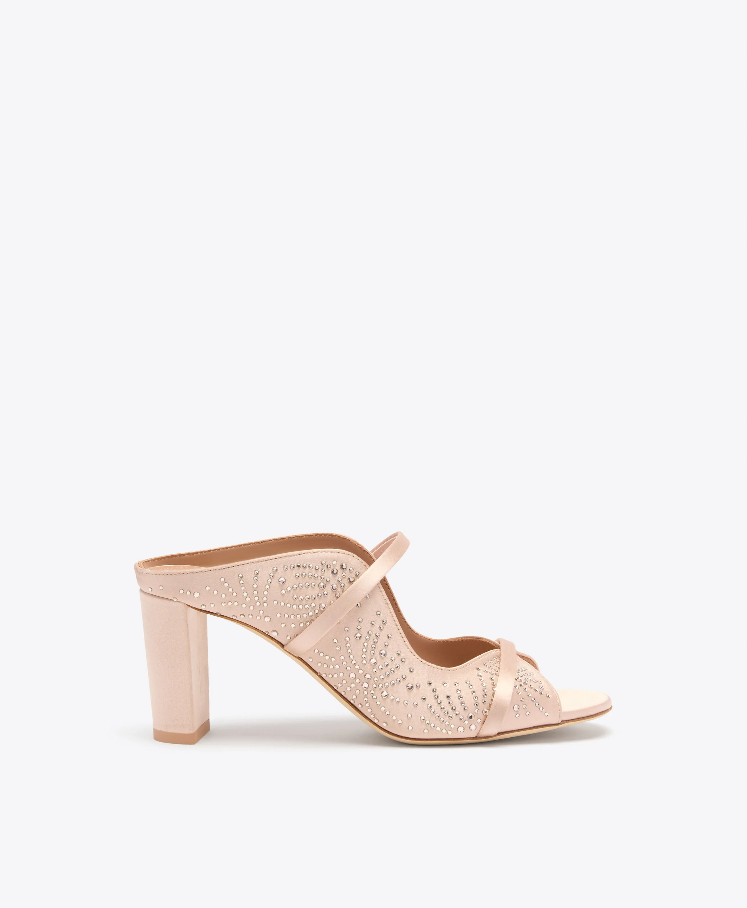 Norah returns this season in radiant champagne satin. Delicately embellished with tonal crystals in a layered fireworks motif, Norah is reimagined into a modern evening classic with irresistible shine, balanced by a sculpted 70mm block heel. - Colour: Champagne - Material: Satin - Sole and Lining: 100% Leather - Style: Sandals - Handmade in Italy - Fitting: True to size SIZE & FIT - True to size - Italian sizing - Model wears size IT37, US7, UK4 - Heel height 70mm/2.7in