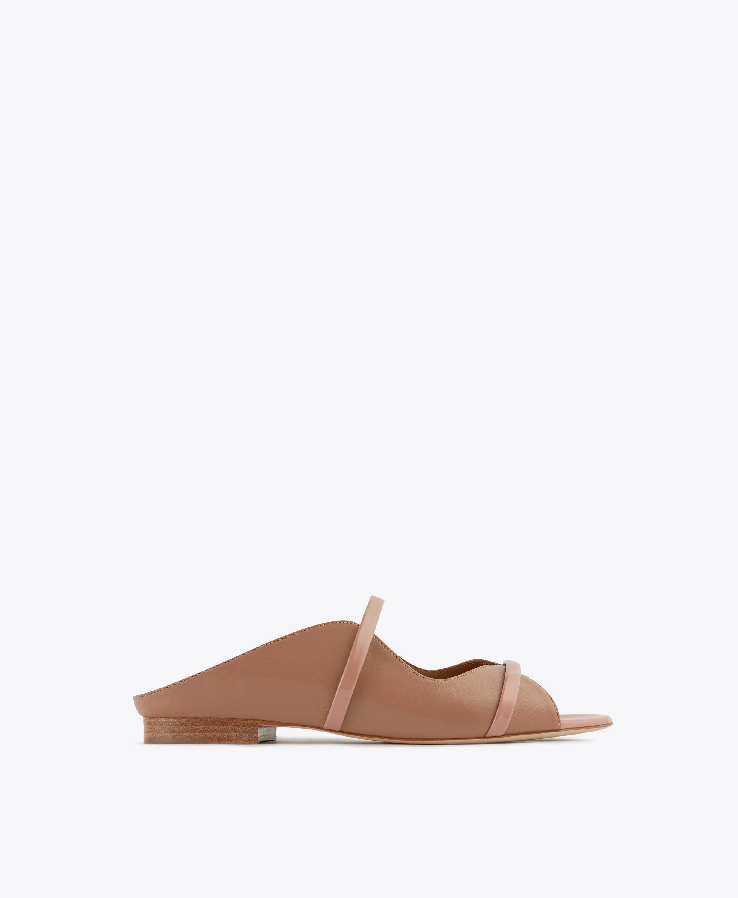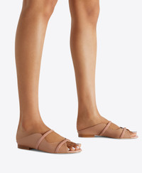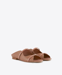 The Norah flat sandal bears the hallmarks of our iconic mule. Its tapered upper in nude Nappa Leather snake the sinuous lines of the foot, framing a peep-toe point; signature Patent straps add tonal duality. Constructed in Italy using traditional artisan techniques, the backless Norah Flat invites elegance to informality. A flattering daytime staple; wear with jeans and feminine dresses. - Colour: Nude - Material: Nappa/Patent - Sole and Lining: 100% Leather - Style: Flat Sandal - Handmade in Italy SIZE & FIT - True to size - Italian sizing - Model wears size IT37, US7, UK4