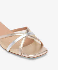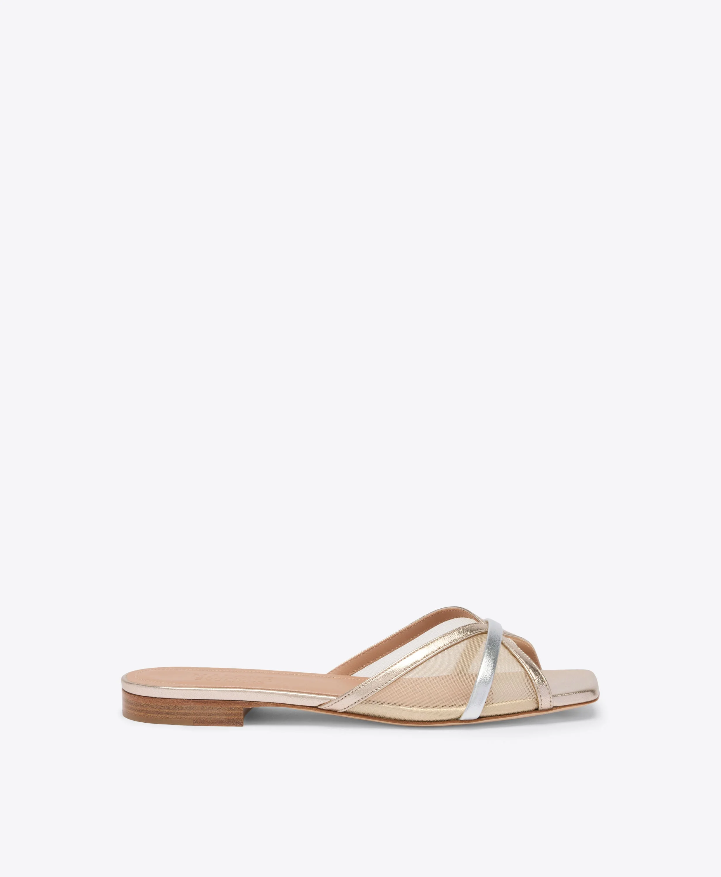 Delicate details meet day-to-evening elegance. The Perla flat sandal returns in luminous champagne mesh, softened by metallic silver Nappa trims. A slender strap accents the square-toe silhouette, while the 10mm monoblock heel makes it perfect for moments when ease and elegance go hand in hand. - Colour: Nude/Champagne/Silver - Material: Mesh/Metallic Nappa - Sole and Lining: 100% Leather - Style: Flat Sandals - Handmade in Italy - Fitting: True to size SIZE & FIT - True to size - Italian sizing - Model wears size IT37, US7, UK4 - Heel height 10mm/0.4in