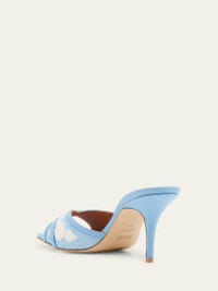 Malone Souliers "Perla" twotone woven raffia mule sandals with leather trim 2.75 in / 70 mm stiletto heel Peep toe Slide style Leather outsole Lining: Unlined Made in Italy