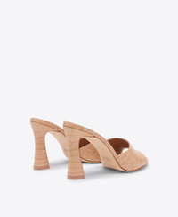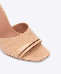 The Roxanne mule reinterprets Old Hollywood glamour with a modern edge. Inspired by the iconic silhouettes worn by cinema's golden-age starlets, Roxanne brings timeless sophistication into the present. Designed with a striking open square toe and a 90mm flared block heel, this exclusive style is crafted from buff glossy croc-embossed leather, balancing classic elegance with contemporary boldness. - Colour: Buff - Material: Embossed Gloss Leather - Sole and Lining: 100% Leather - Style: Heeled Sandals - Handmade in Italy - Fitting: True to size - Malone Souliers Exclusive SIZE & FIT - Fits true to size - Italian sizing - Model wears size IT37, US7, UK4 - Heel height 90mm/3.5in