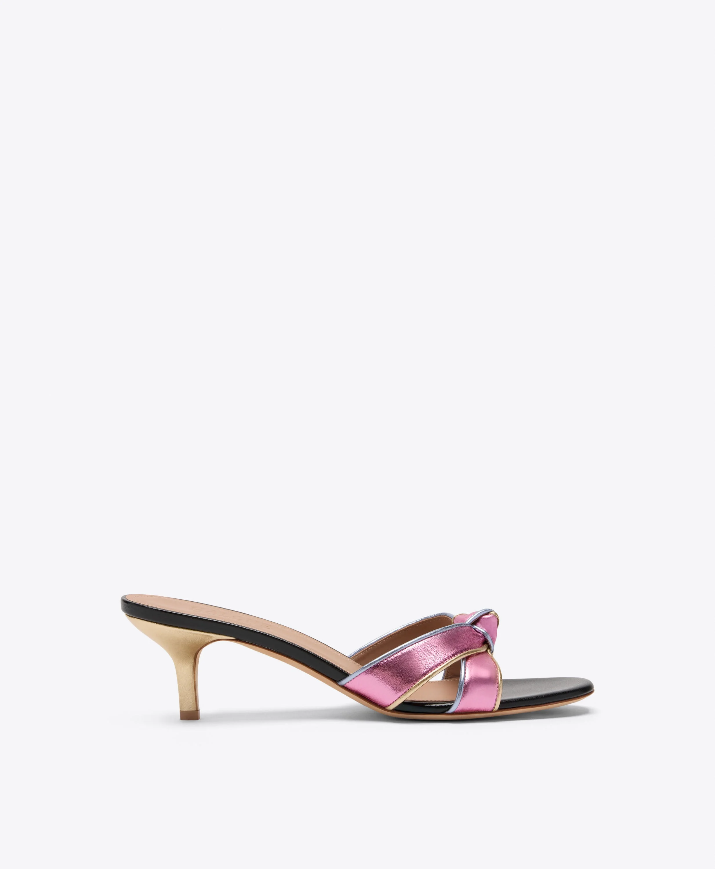 Soft glamour meets all-day ease. Raquel steps into the season in a pink metallic finish, detailed with gold and silver knotted straps that add texture and charm. Crafted in Italy, this open-toe sandal sits on a 45mm kitten heel, offering subtle height and effortless elegance. - Colour: Camellia/Metallic Mix - Material: Metallic Nappa - Sole and Lining: 100% Leather - Style: Heeled Sandals - Handmade in Italy - Fitting: True to size SIZE & FIT - True to size - Italian sizing - Model wears size IT37, US7, UK4 - Heel height 45mm/1.7in