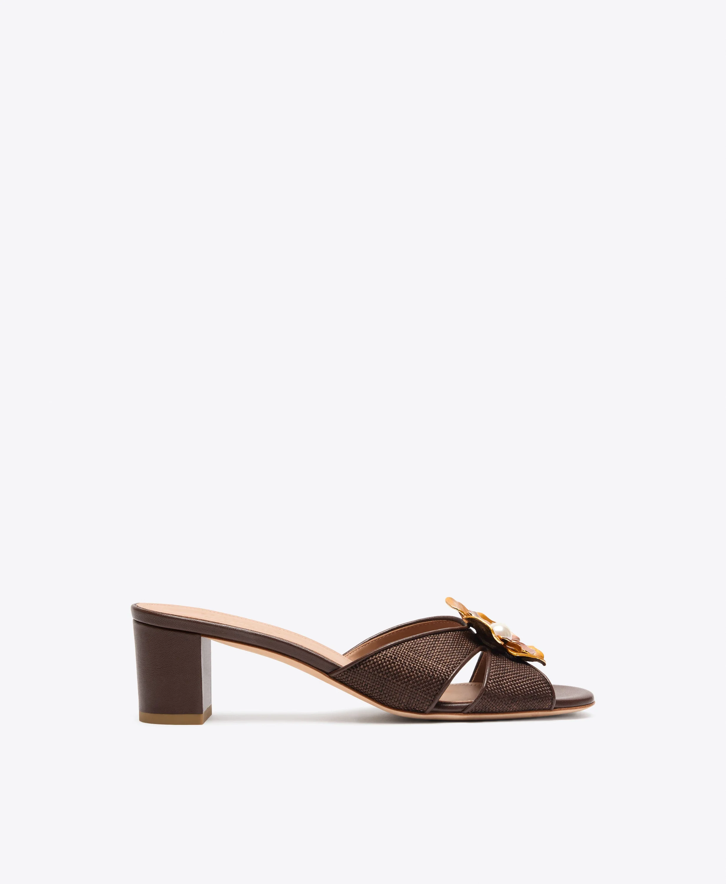 Suri celebrates the art of detail. A modern ode to vintage charm, this mule sandal is woven in dark brown raffia and adorned with a hand-finished metal floral motif featuring a lustrous pearl centre. Resting on a 45mm straight block heel, it’s a timeless addition to every wardrobe. - Colour: Dark Brown/Tobacco - Material: Raffia/Nappa - Sole and Lining: 100% Leather - Style: Sandals - Handmade in Italy - Fitting: True to size SIZE & FIT - True to size - Italian sizing - Model wears size IT37, US7, UK4 - Heel height 45mm/1.7in