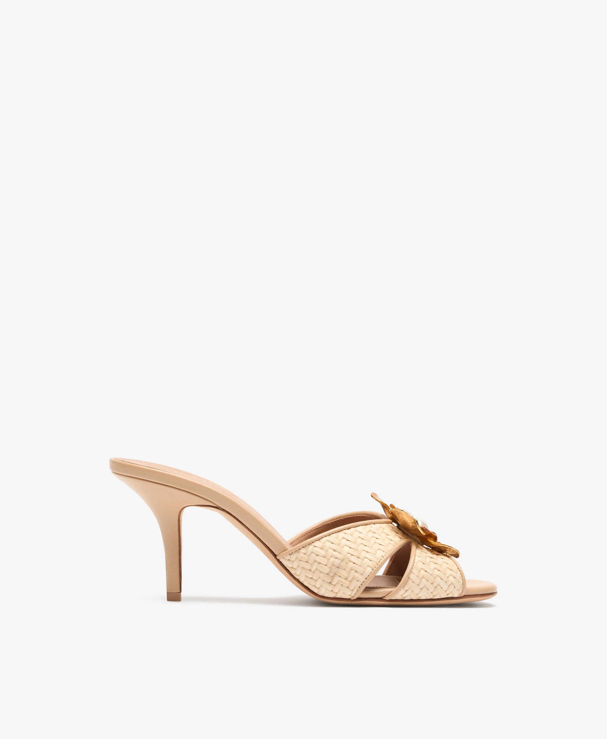 Natural texture meets luminous detail. The cut-out Suri sandal is crafted in buff raffia with nappa trims and finished with a gold-toned floral motif and pearl centre. Elevated on a 70mm stiletto heel, it redefines classic femininity through modern craftsmanship. - Colour: Buff - Material: Raffia/Nappa - Sole and Lining: 100% Leather - Style: Sandals - Handmade in Italy - Fitting: True to size SIZE & FIT - True to size - Italian sizing - Model wears size IT37, US7, UK4 - Heel height 70mm/2.7in