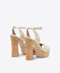 A statement silhouette inspired by icons of the 70s. The Sylvie platform sandal translates retro glamour into a new-season expression, crafted in striped raffia with tonal Nappa trims. Defined by a dramatic 125mm cork-covered block heel and platform, this limited-edition design balances natural texture with bold, confident height. - Colour: Cream/Cream - Material: Stripe Raffia/Nappa - Sole and Lining: 100% Leather - Style: Platform Sandals - Handmade in Italy - Fitting: True to size - Malone Souliers Exclusive SIZE & FIT - True to size - Italian sizing - Model wears size IT37, US7, UK4 - Heel height 125mm/4.9in