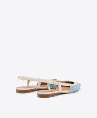 A new-season design infused with the ease of 1960s style. Introduced for SS26, the Tate flat slingback arrives in blue floral denim with smooth white Nappa trims. Finished with a pointed toe and dainty round buckle, the silhouette rests on a minimal 10mm monoblock heel. - Colour: Blue/Cream - Material: Floral Denim/Nappa - Sole and Lining: 100% Leather - Style: Flat Slingbacks - Handmade in Italy - Fitting: True to size SIZE & FIT - True to size - Italian sizing - Model wears size IT37, US7, UK4 - Heel height 10mm/0.4in
