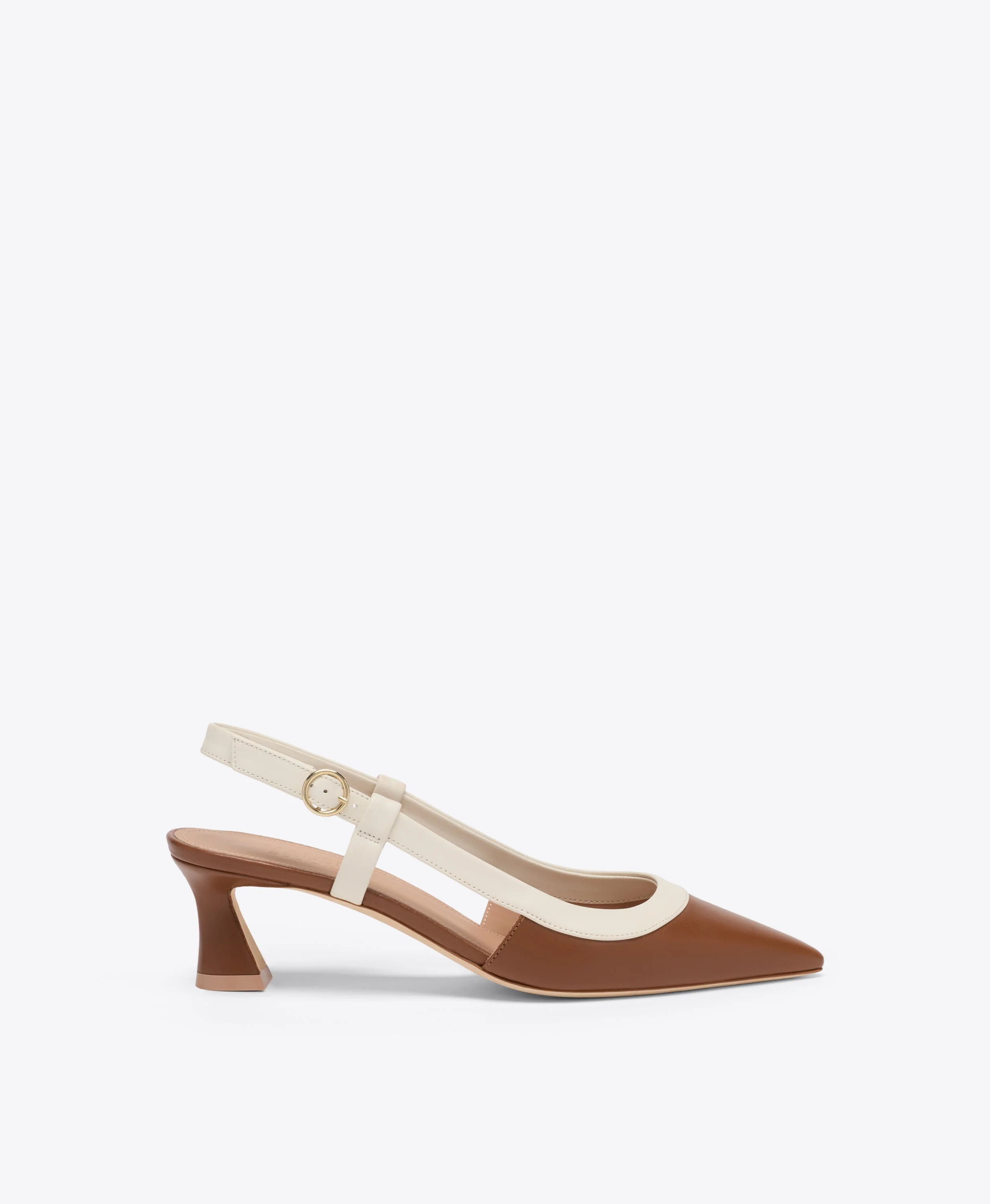 The new-season Tate slingback channels the elegance of late '60s and early '70s style. A timeless shape reimagined for SS26, it is handcrafted in Italy from brown Nappa leather with cream piping. Its pointed-toe silhouette is refined with a buckled strap and lifted by a 45mm kitten heel. - Colour: Oak/Cream - Material: Nappa - Sole and Lining: 100% Leather - Style: Kitten Heels - Handmade in Italy - Fitting: True to size SIZE & FIT - True to size - Italian sizing - Model wears size IT37, US7, UK4 - Heel height 45mm/1.7in