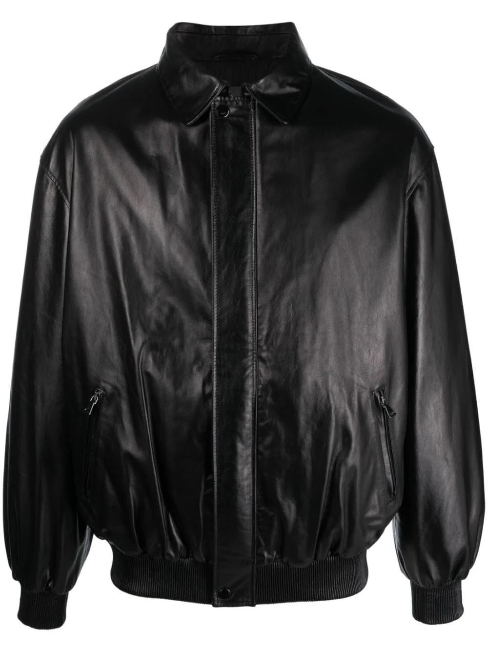 biker bomber jacket black leather classic collar concealed front fastening long sleeves two side zip-fastening pockets When buying this unisex item, keep in mind that it is graded in standard men's sizing. Imported Composition Leather 100% SIZE & FIT Model measurements Height 5 ft 10 in(1.78 m) Bust/Chest 31.49 in(80 cm) Hips 36.22 in(92 cm) Waist 25.59 in(65 cm) FittingInformation This piece fits true to size. We recommend you get your regular size Cut for a loose fit Made with a mid-weight non-stretch fabric