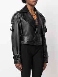 Hana cropped biker jacket black leather notched lapels epaulettes drop shoulder long sleeves belted waist cropped Imported Composition Outer: Leather 100% Lining: Viscose 80%, Polyester 20% SIZE & FIT Model measurements Height 5 ft 10 in(1.77 m) Bust/Chest 34.64 in(88 cm) Hips 35.43 in(90 cm) Waist 24.8 in(63 cm) FittingInformation This piece fits true to size. We recommend you get your regular size Cut for a loose fit. Comes with an adjustable belt for a flexible fit at the waist Made with a mid-weight non-stretch fabric Washing instructions Specialist Cleaning