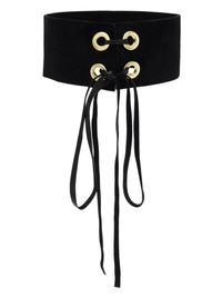 Mira 4 leather chocker necklace Highlights - Black - Calf suede - Gold-tone hardware - Rear tie fastening - Adjustable fit Imported SIZE & FIT Model measurements Height 5 ft 9 in(1.76 m) Bust/Chest 33.07 in(84 cm) Hips 38.58 in(98 cm) Waist 24.8 in(63 cm) Measurement Length when open 11.81 in(30 cm) WIDTH 1.96 in(5 cm)