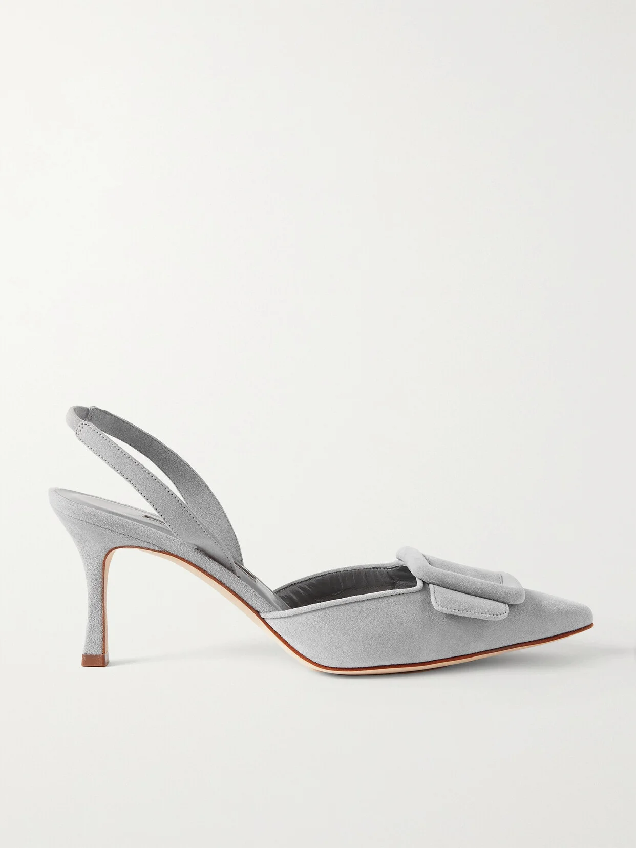 Manolo Blahnik's 'Maysli' pumps are a slingback interpretation of the label's 'Maysale' silhouette, which first debuted in 1991. Made in Italy from light-gray suede, they have slender 70mm heels and pointed toes topped with signature buckles. Wear yours with everything from formal dresses to tailoring.
