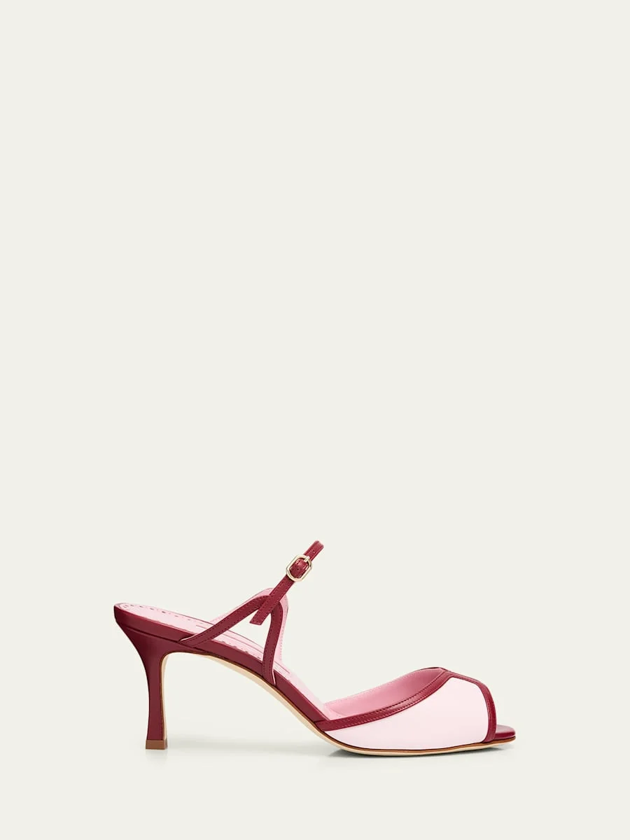 Manolo Blahnik's "Versa" sandals are crafted from colorblocked lambskin leather 2.75 in / 70 mm covered stiletto heel Open toe Adjustable buckle strap Slipon style Leather lining and outsole Made in Italy