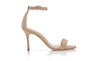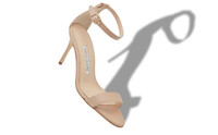 Beige nappa leather open toe sandals featuring ankle strap closure and stiletto high heel. Upper: 100% lamb nappa. Sole: 100% calf leather. Lining: 100% kid leather. Heel measures 90 mm. Made in Italy. Product ID: 9XX-0747-0022