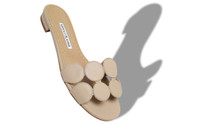 Beige nappa leather open toe flat sandals featuring circular geometric strap and flat stacked heel. Upper: 100% lamb nappa. Sole: 100% calf leather. Lining: 100% kid leather. Heel measures 10 mm. Italian sizing. Made in Italy. Product ID: 424-1839-0007