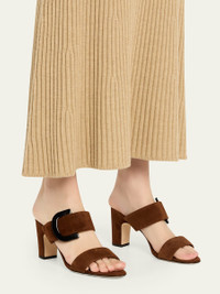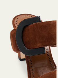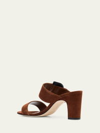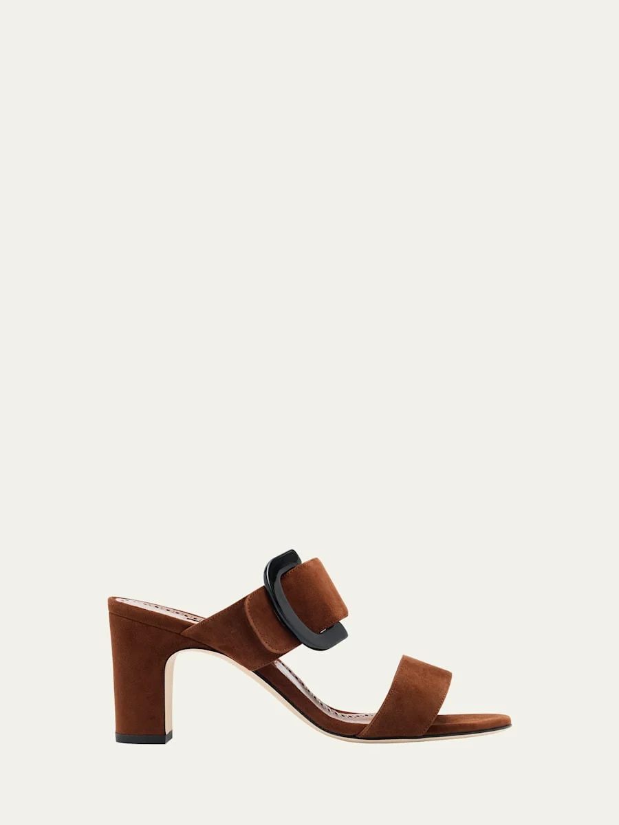 Manolo Blahnik "Betimusa" mule sandals in suede with an oversized buckle accent 2.75 in / 70 mm covered block heel Round open toe Dual band upper Easy slide style Goat leather lining Leather outsole Made in Italy Online Inquiries: BGS21_X6ZE7| Store Inquiries: #5070360