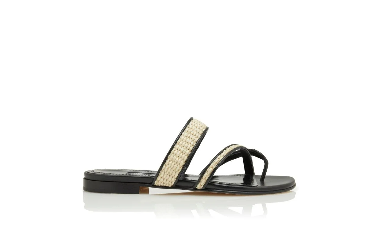 Black raffia open toe flat sandals featuring crossover front straps with toe stem, instep strap and beige nappa leather edging details. Finished with flat stacked heel. Upper: 95% raffia, 5% lamb nappa. Sole: 100% calf leather. Lining: 100% kid leather. Heel measures 10 mm. Italian sizing. Made in Italy. Product ID: 224-1617-0008