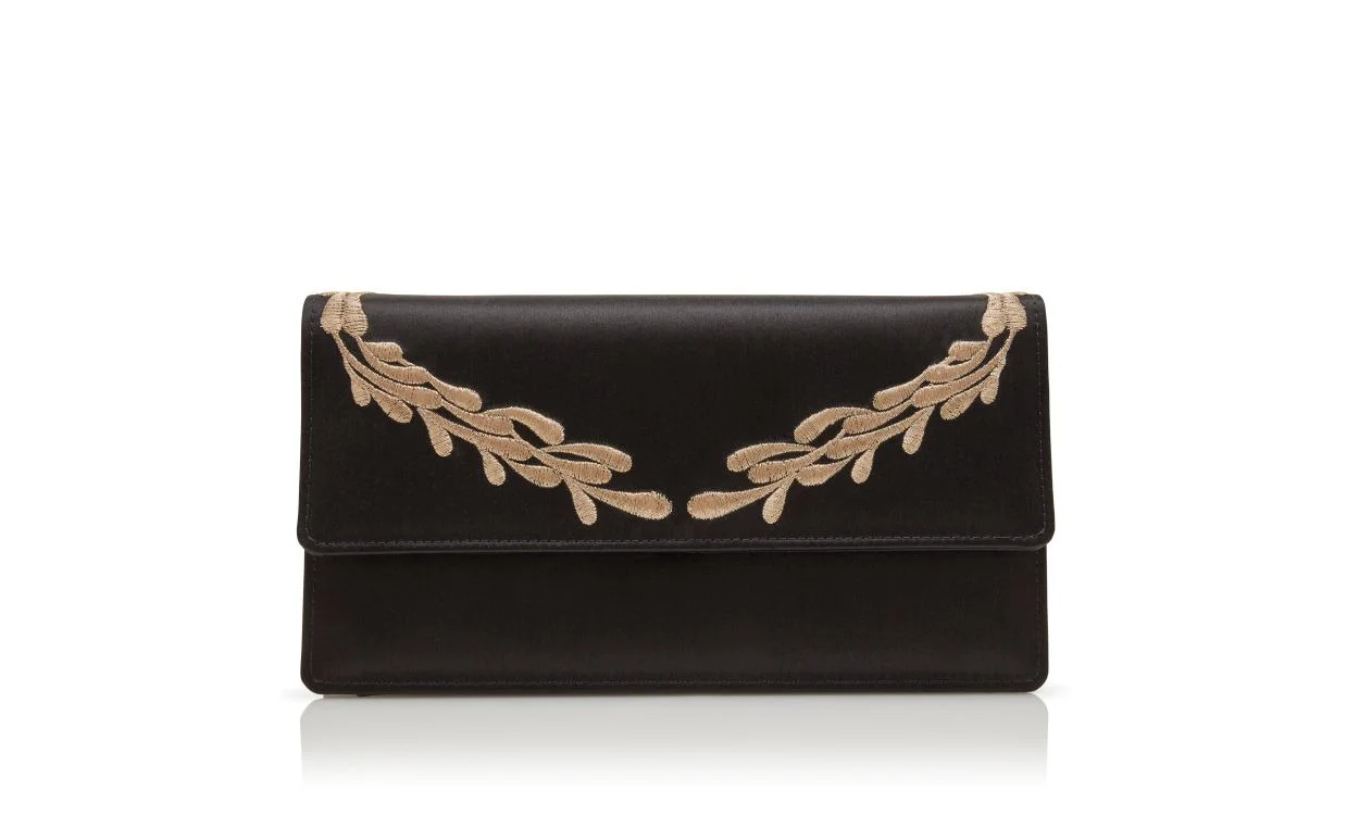 Black satin rectangular clutch bag featuring embroidered gold cascading leaf design and flap over detail. Contains internal compartment, mirror and removable chains with two length options. Magnetic closure. Upper: 72% viscose, 28% silk.Lining: 72% viscose, 28% silk.Made in Italy.Height: 12 cm.Length: 24 cm.Width: 6 cm.Straps measure 37 cm and 110 cm. Product ID: 325-3134-0001