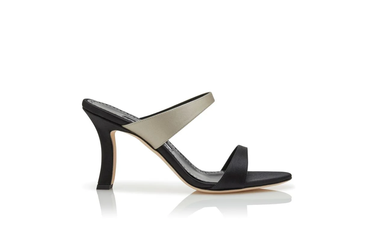 Black satin open toe mules featuring toe strap and grey instep strap. Finished with angular high heel. Upper:72% viscose, 28% silk.Sole:100% calf leather.Lining:100% kid leather.Heel measures: 90 mm. Italian sizing. Made in Italy. Product ID: 325-3108-0005