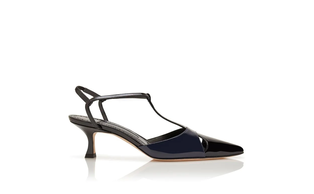 Black and Navy Blue Patent Leather T-Bar Pumps