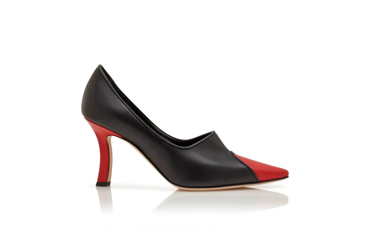 Black calf leather pointed toe pumps featuring red toe cap with black edging and red angular high heel. Upper:100% calf leather.Sole:100% calf leather.Lining:100% kid leather.Heel measures:90 mm. Italian sizing. Made in Italy. Product ID: 325-3050-0001
