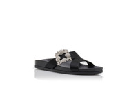 Black satin open toe flat mules featuring crossover straps with decorative clear crystal jewel buckle. Finished with flat rubber sole. Upper: 72% viscose, 28% silk. Sole: 100% rubber. Lining: 100% kid leather. Heel measures 10 mm. Italian sizing. Made in Italy. Product ID: 123-2425-0013