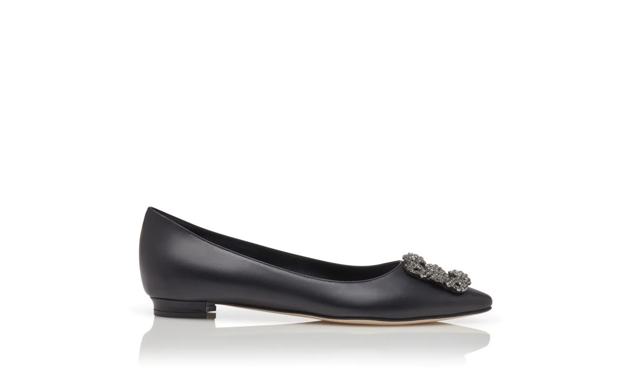 Black calf leather almond toe flat shoes finished with a square crystal buckle encased in a gunmetal frame. Upper: 100% calf leather. Sole: 100% cow leather. Lining: 100% kid leather. Heel measures 10mm. Italian sizing. Made in Italy. Product ID: 121-1657-0001