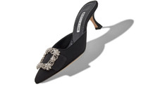 Black crepe de chine mules featuring decorative square crystal buckle, pointed toe and stiletto kitten heel. Upper: 100% silk. Sole: 100% cow leather. Lining: 100% goat skin. Heel measures 50 mm. Italian sizing. Made in Italy. Product ID: 318-0585-0013