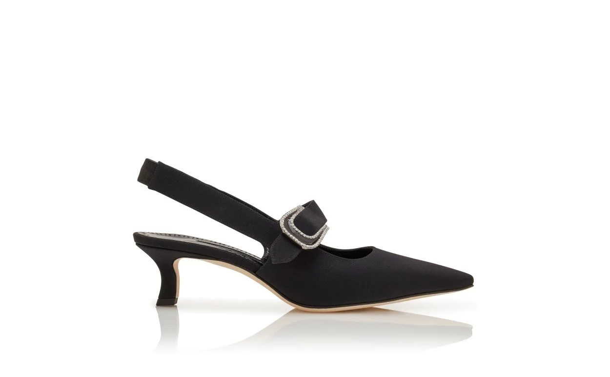 Black crepe de chine pointed toe pumps featuring jewel buckle detail and elasticated slingback design. Finished with flared block low heel. Upper: 100% silk. Sole: 100% calf leather. Lining: 100% kid leather. Heel measures 50 mm. Italian sizing. Made in Italy. Product ID: 225-1837-0001