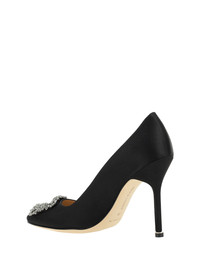 Silk Satin Hangisi Pumps by Manolo Blahnik, almond toe, iconic Swarovski crystal buckle applique on front, leather stiletto heel, logo-embossed insole. DETAILS sku 9XX0664_0015 composition: CALF LEATHER BOS TAURUS 100% SILK 32% VISCOSE 68% color group: BLACK gender: WOMAN season: SS25 size chart: SHOES IT category name: PUMPS dimensions: 10.5 cm