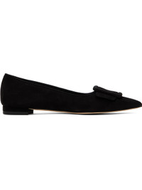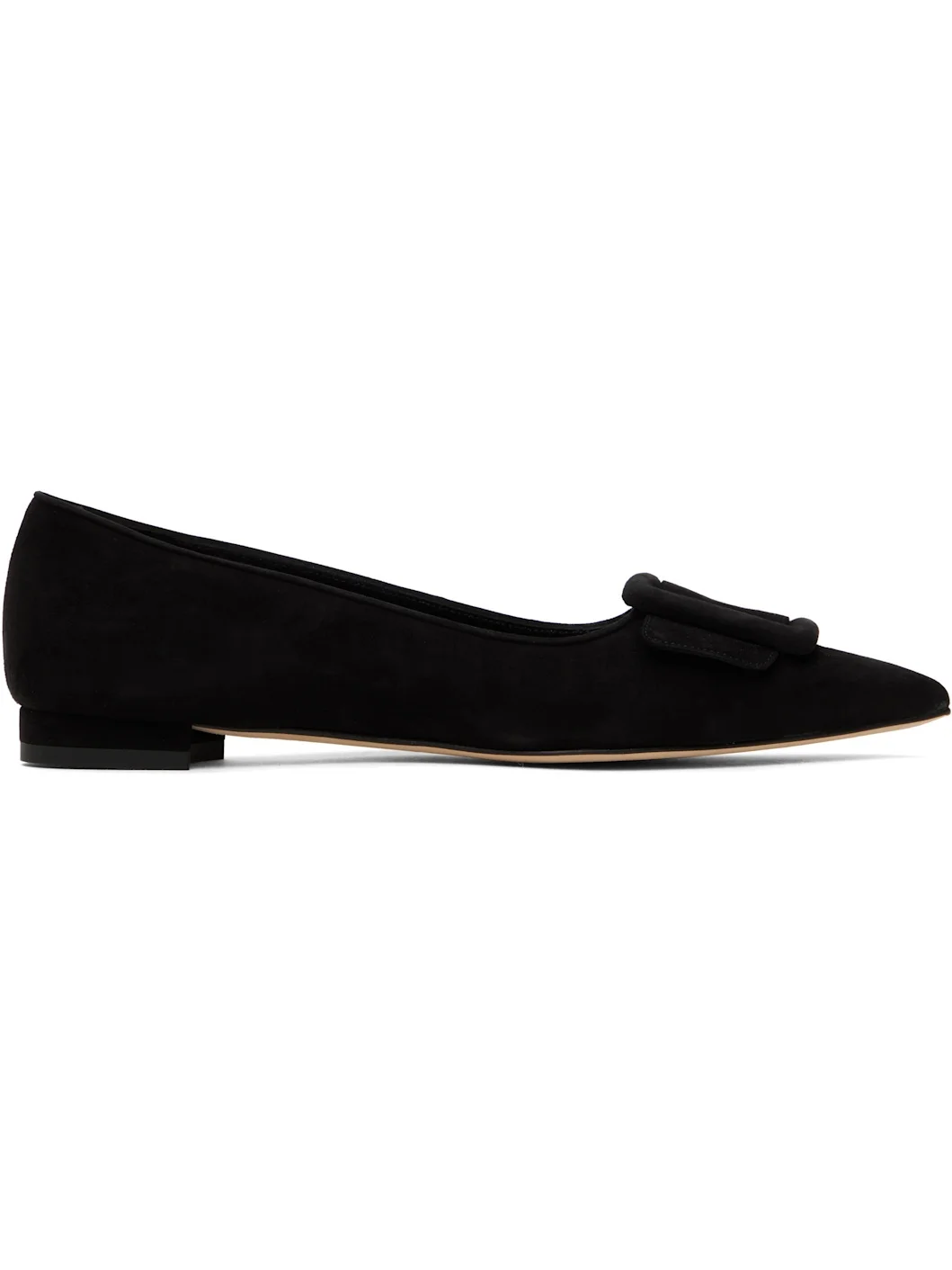 Handcrafted kidskin suede ballerina flats in black. · Pointed toe · Buckle hardware at vamp · Inset logo patch at padded footbed · Grained kidskin lining · Covered heel with rubber injection · Calfskin nubuck sole Supplier color: Black Upper: kidskin. Sole: calfskin, rubber. Made in Italy 251140F118001