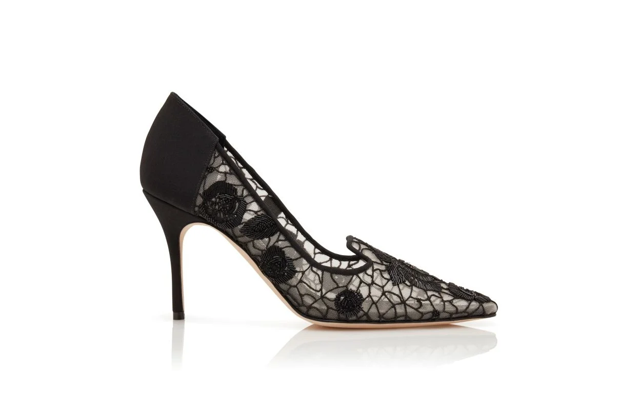 Black mesh pointed toe pumps featuring floral embroidered design, black satin counter detail and stiletto high heel. Upper: 100% polyamide. Sole: 100% calf leather. Lining: 100% polyamide. Heel measures 90 mm. Made in Italy. Product ID: 225-1861-0001