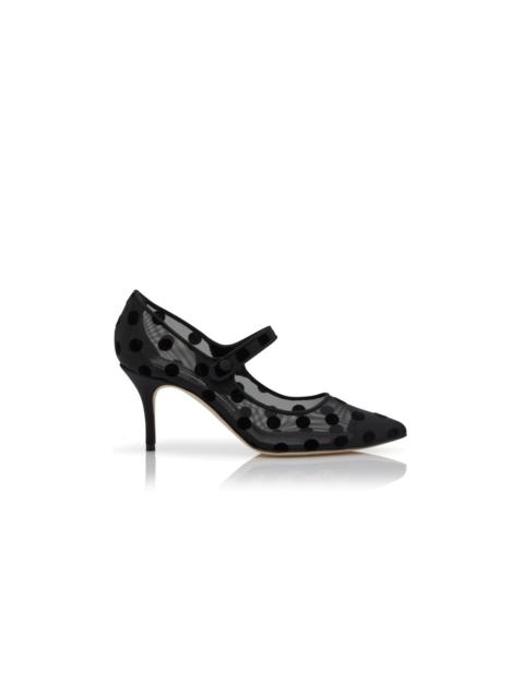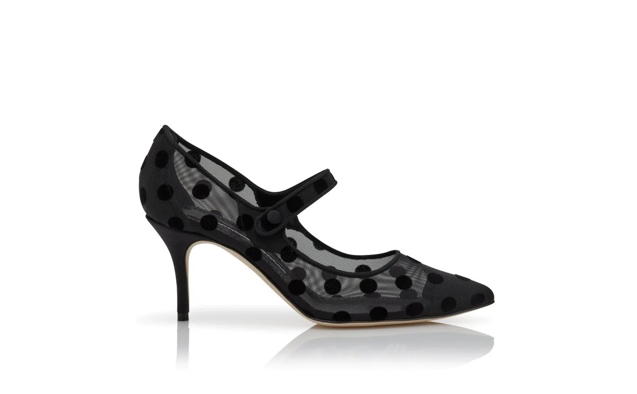 Black mesh pointed toe Mary Jane flat pumps featuring black polka dot detail, black grosgrain edging and front strap with black button closure. Finished with black counter, toe point and flat stacked heel. Upper: 80% polyamide, 10% viscose, 10% silk. Sole: 100% calf leather. Lining: 100% kid leather. Heel measures 70 mm. Italian sizing. Made in Italy. Product ID: 323-2740-0001