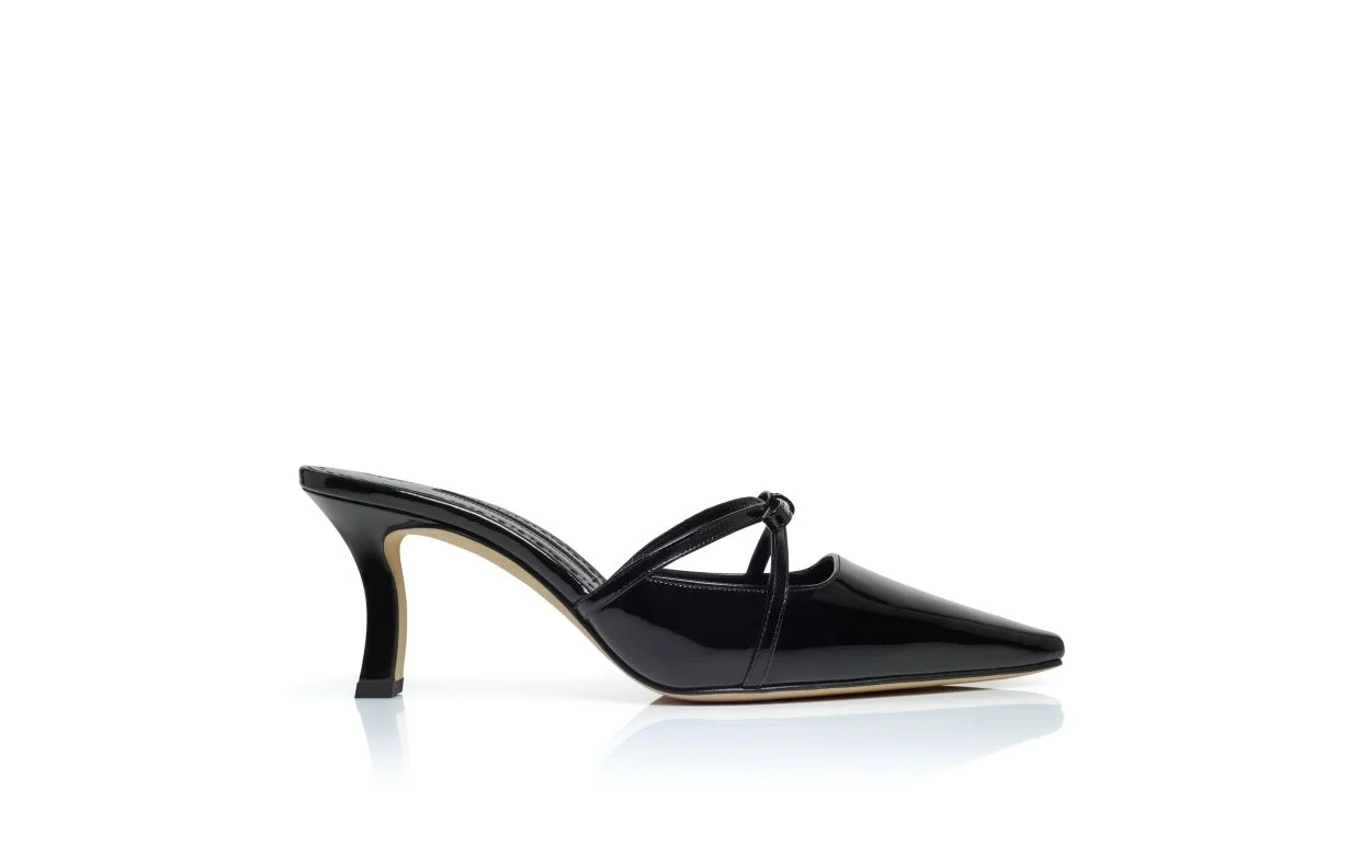 Black patent leather pointed toe mules featuring bow detail and flared block mid heel. Upper: 100% patent calf. Sole: 100% calf leather. Lining: 100% kid leather. Heel measures 70 mm. Italian sizing. Made in Italy. Product ID: 225-1827-0002