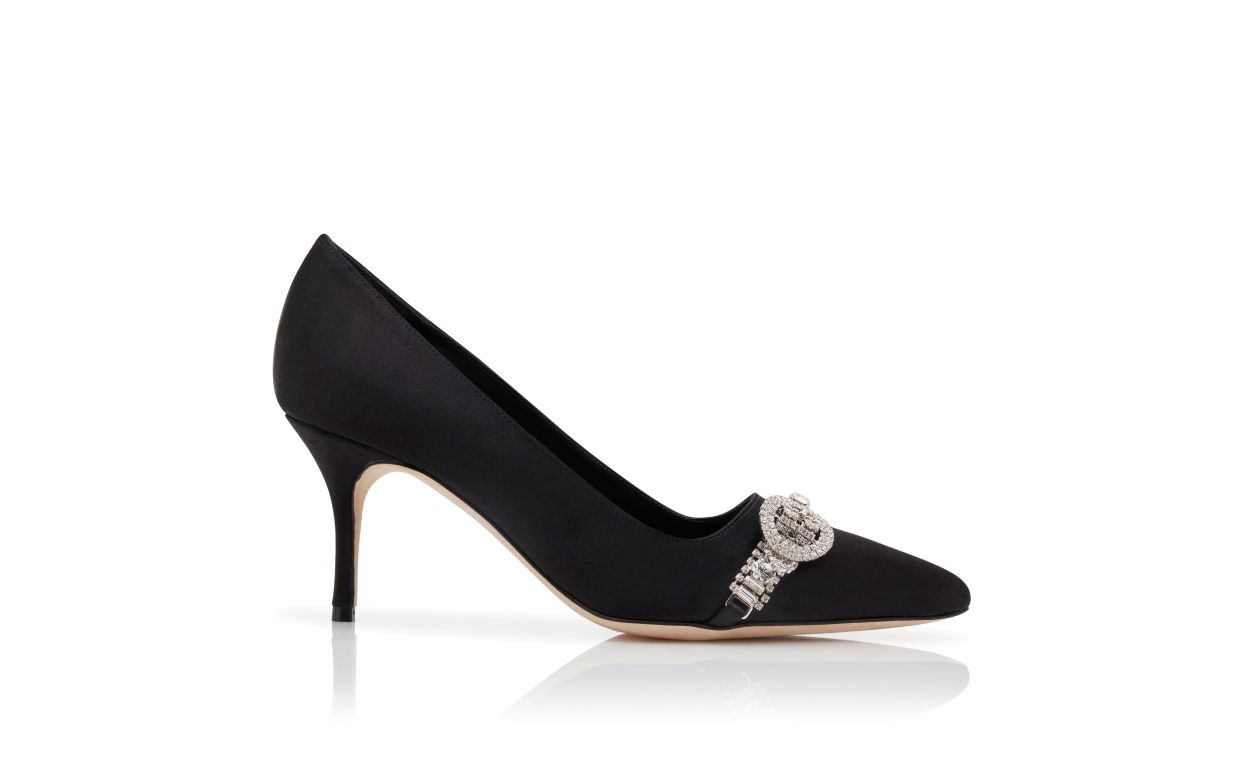 Black satin pointed toe pumps featuring jewel embellished buckle and stiletto mid heel. Upper: 72% viscose, 28% silk. Sole: 100% calf leather. Lining: 100% kid leather. Heel measures 70 mm. Italian sizing. Made in Italy. Product ID: 424-1928-0001