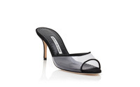 PVC open toe mules featuring open toe design with black suede trim and stiletto mid heel. Upper: 90% PVC, 10% kid suede. Sole: 100% calf leather. Lining: 100% kid leather. Heel measures 70mm. Italian sizing. Made in Italy. Product ID: 422-1418-0001
