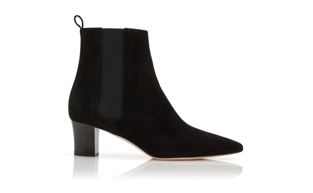 Black suede slip-on pointed toe ankle boots featuring elasticated inset, rear pull tab and low block heel. Upper: 100% kid suede. Sole: 100% calf leather. Lining: 100% kid leather. Heel measures 50mm. Italian sizing. Made in Italy. Product ID: 323-2616-0001