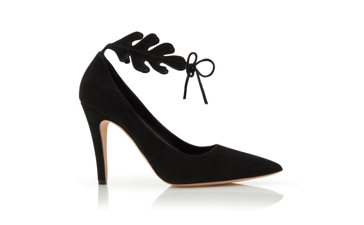 Black suede pointed toe pumps featuring leaf design ankle strap with lace up detail. Finished with stiletto high heel. Upper: 98% kid suede, 2% lamb nappa. Sole: 100% calf leather. Lining: 100% kid leather. Heel measures 105 mm Italian sizing. Made in Italy. Product ID: 124-2496-0001