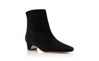 Black suede almond toe ankle boots featuring side zip closure and low block heel. Upper: 100% suede. Sole: 100% calf leather. Lining: 100% kid leather. Heel measures 30mm. Italian sizing. Made in Italy. Product ID: 223-1315-0001