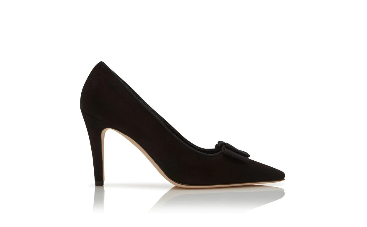 Black suede pointed toe pumps featuring black decorative bow detail, tonal grosgrain trim and stiletto high heel. Upper: 100% kid suede. Sole: 100% calf leather. Lining: 100% kid leather. Heel measures 90 mm. Italian sizing. Made in Italy. Product ID: 125-2907-0003