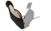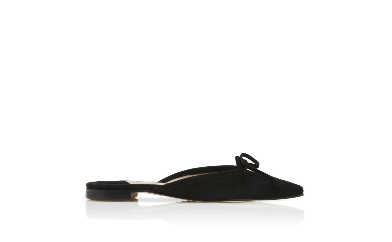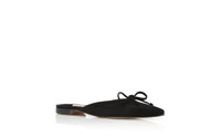 Black suede flat mules featuring almond toe and decorative suede lace-up bow. Upper: 100% calf suede. Sole: 100% cow leather. Lining: 100% goat skin. Heel measures 10mm. Italian sizing. Made in Italy. Product ID: 9XX-0657-0013
